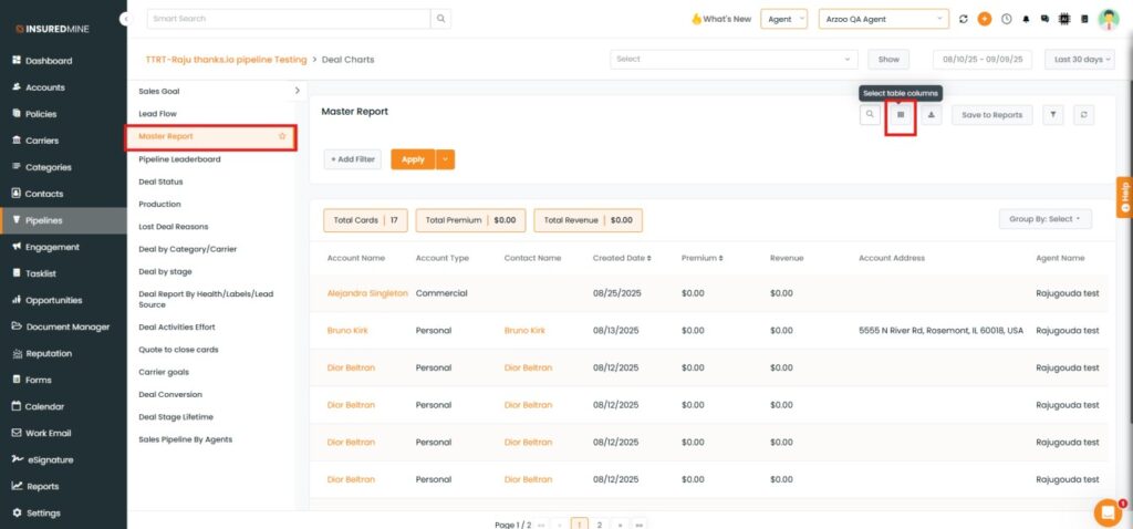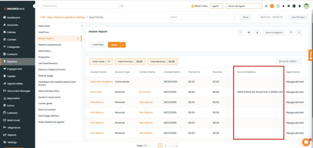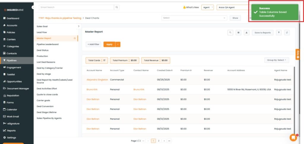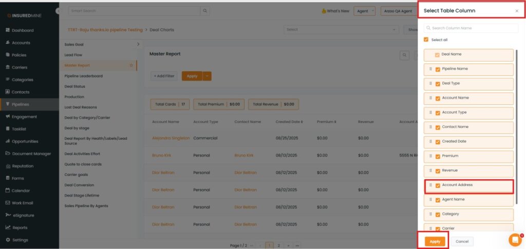 We have introduced a new enhancement in the Pipeline Module. Now, the Account Address option is available in the Select Table Column of the Master Report, allowing users to display or hide the Account Address field in the report table by selecting or deselecting the option.