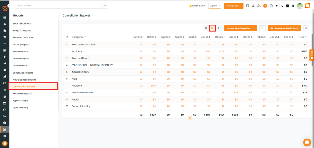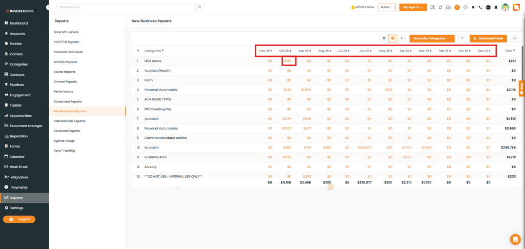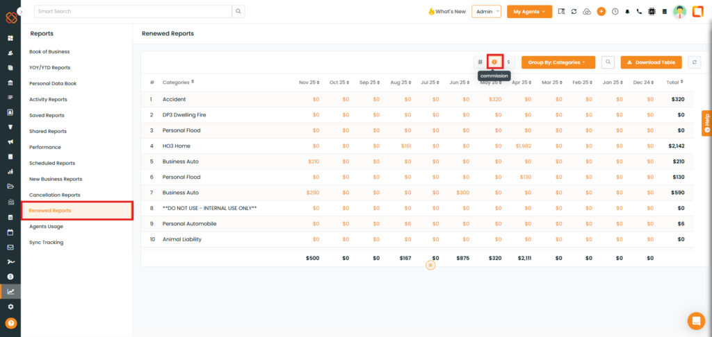 Note: You can also view the commission data in the Cancellation Reports and Renewed Reports by following the same process as in the New Business Reports. You can also download, save to reports, or save as a list.