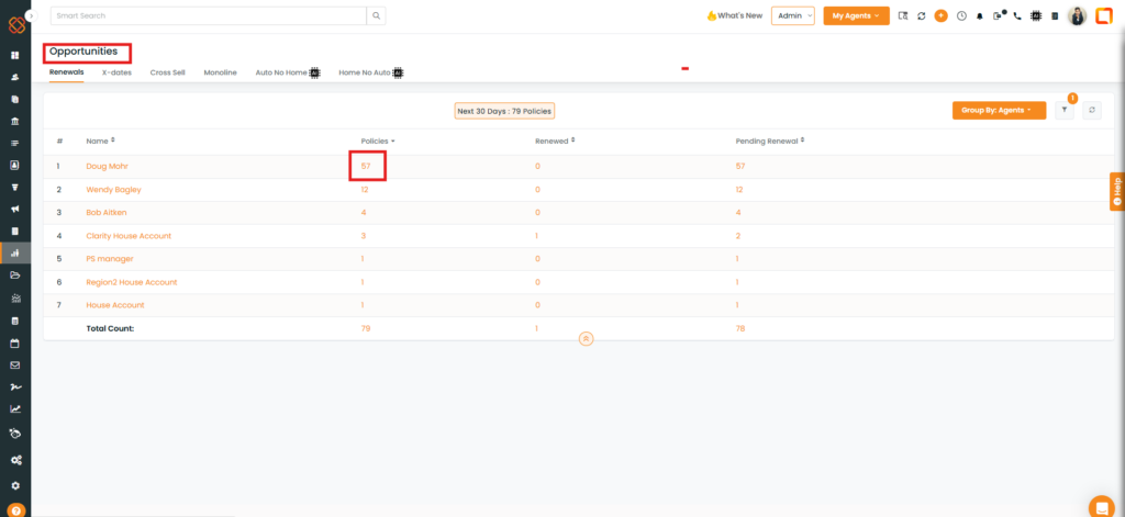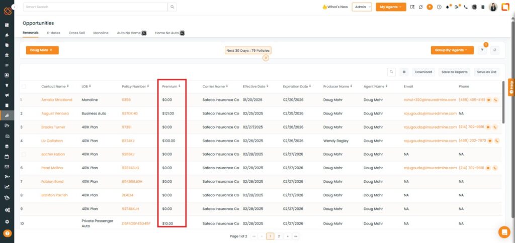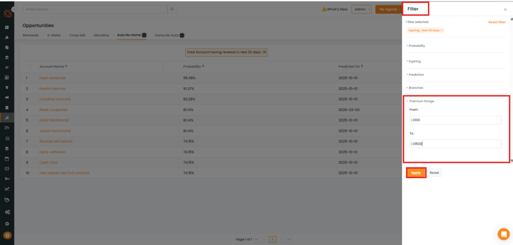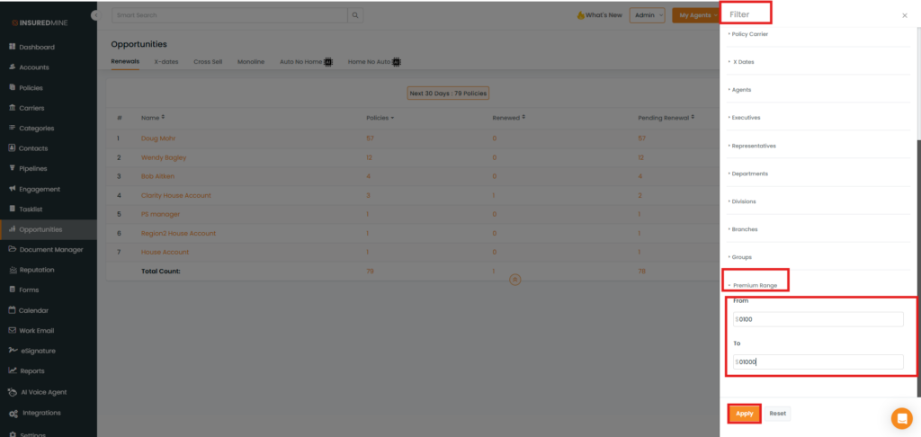 We have introduced a new Premium Range filter in the Renewal, X- dates, cross sell, Monoline, Auto No Home, and Home No Auto section under Opportunities Module.