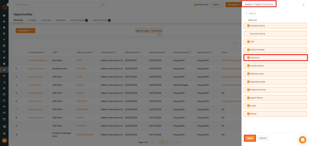Note: The same steps can be used to apply the Premium Range filter and Select Table Columns for X-Date, Monoline, and Cross-Sell.