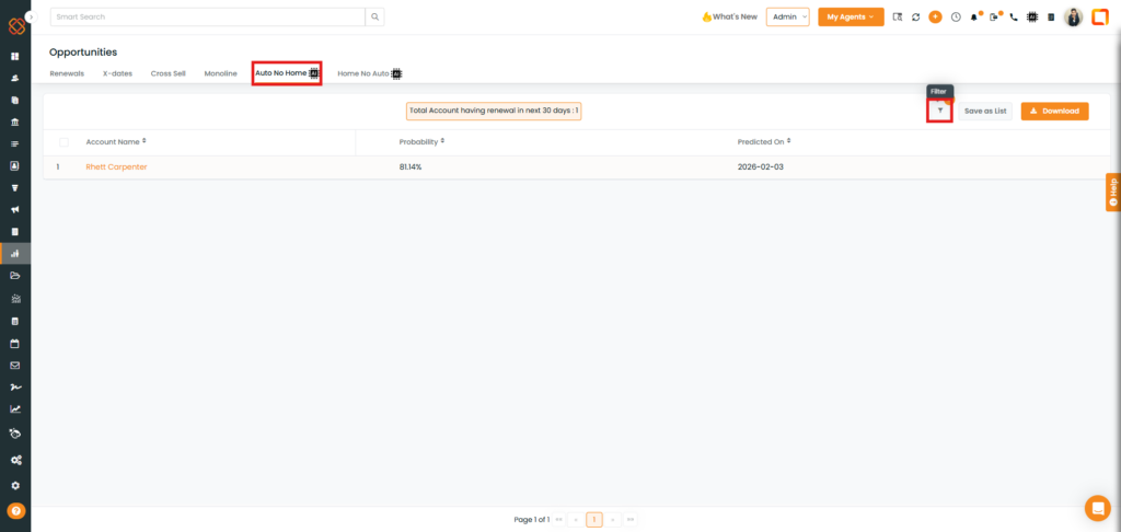 • Here, you can view the Renewal Opportunities page with filtered results.