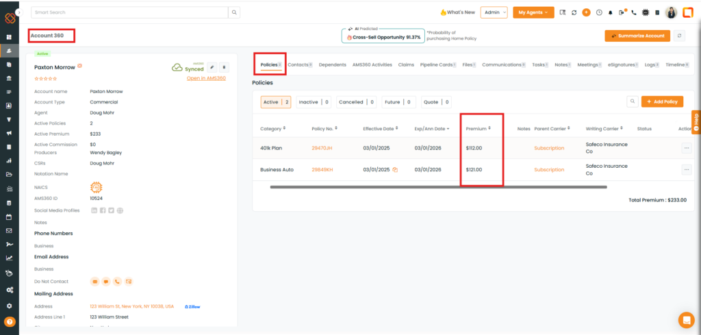 You will be redirected to the Account 360 page, where you can view the premium of policies within the selected premium range.