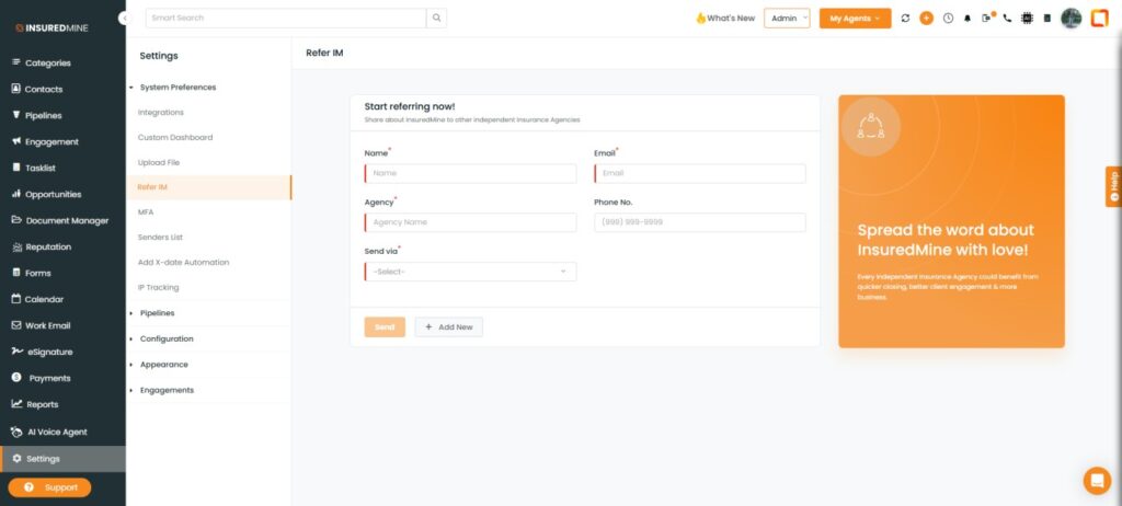 Every Independent Insurance Agency could benefit from quicker closing, better client engagement & more business. Current users of the InsuredMine platform can refer to other agents and agencies to the InsuredMine platform with ease. To refer someone, simply enter their name, email, agency name, and phone number to send them a quick email with information about InsuredMine.