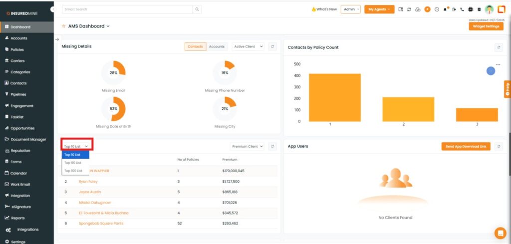 Scroll down the AMS Dashboard to view the Top list section.