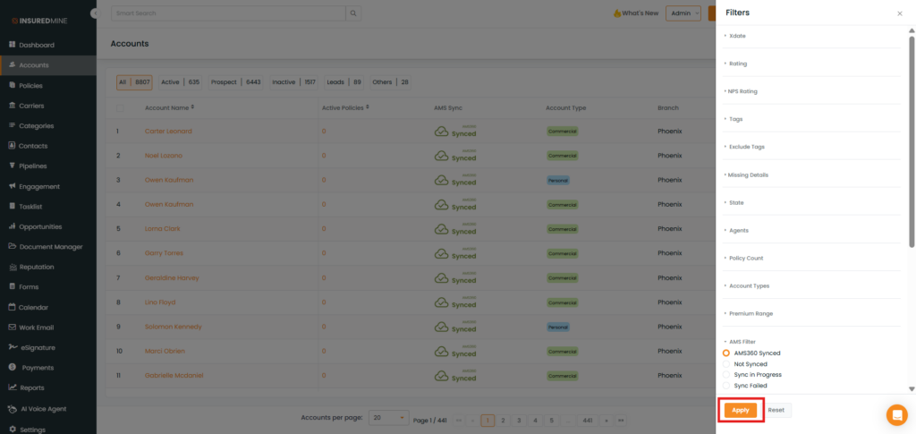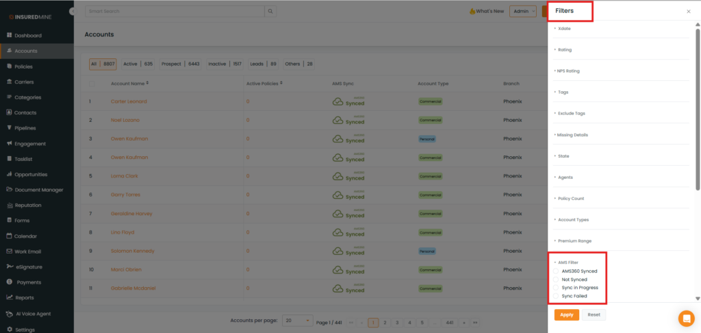 Note: The AMS Filter is available in the Contacts and Policies sections with the same options and usage as the Accounts section.