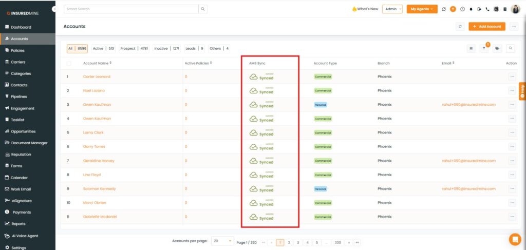 - As shown below, all accounts with the AMS360 Synced status are displayed.
