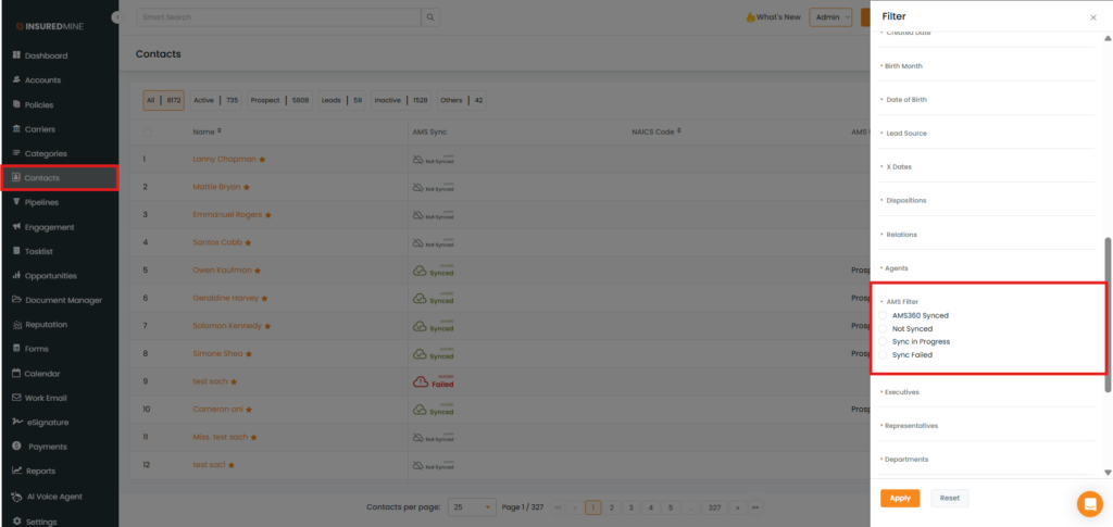 We have introduced a new enhancement in the Accounts, Contacts, and Policies sections. A new AMS Filter is now available, allowing users to filter data by AMS360 Synced, Not Synced, Sync In Progress, and Sync Failed statuses. This enhancement provides better visibility and clarity into the AMS sync status of each account, contact, and policy.