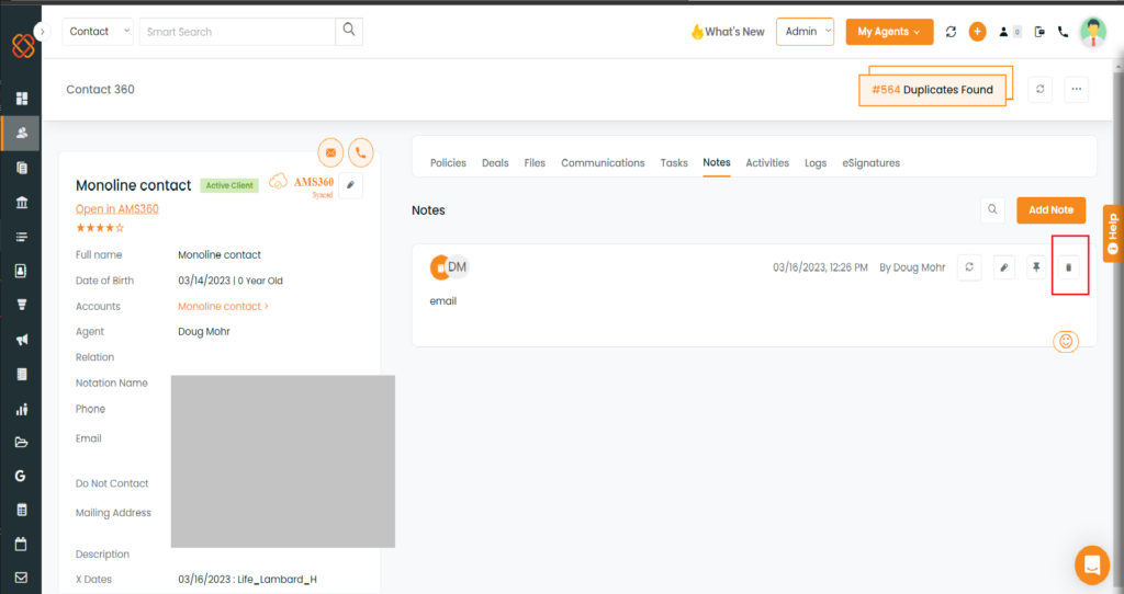 We also have a delete option that, if used, will also remove any notes that have been mapped to contacts and policies.