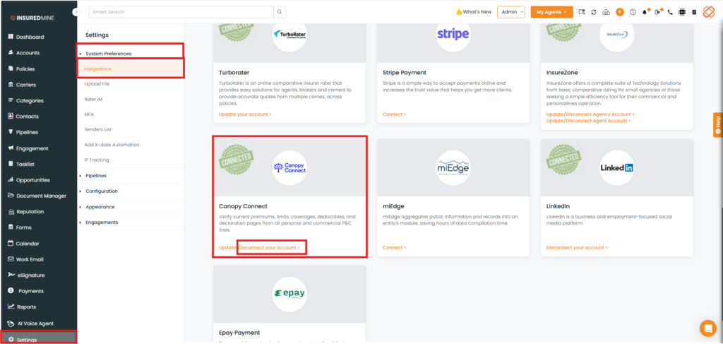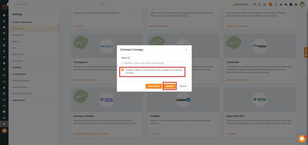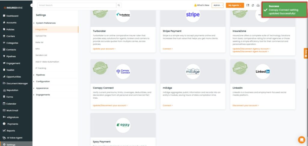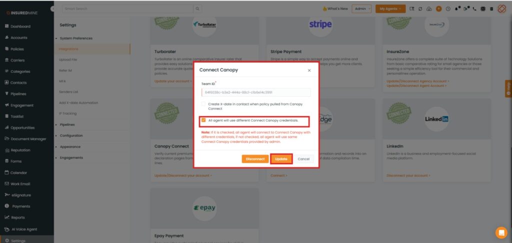 We have introduced a new enhancement to the Canopy integration. Along with Admin users, agents can now also connect their own Canopy accounts. This allows agents to integrate Canopy with InsuredMine by simply enabling the option provided by the Admin.