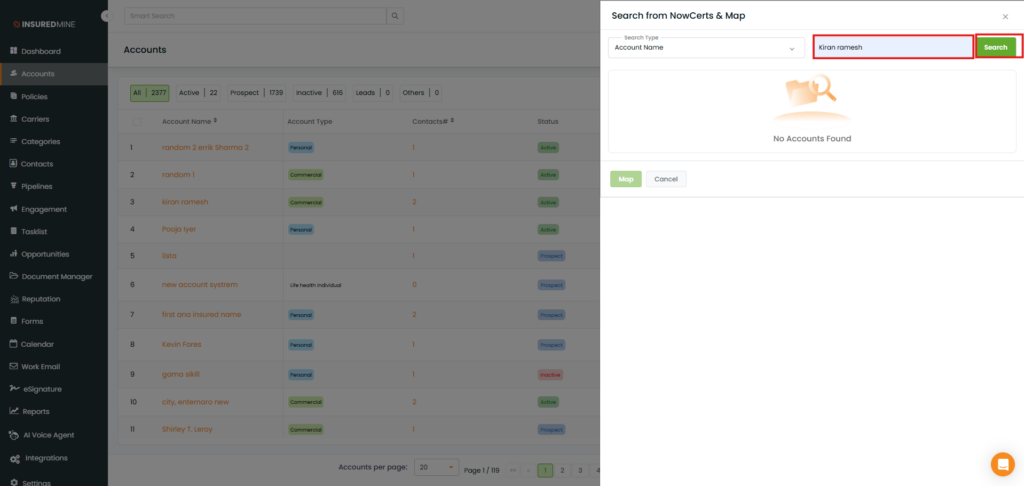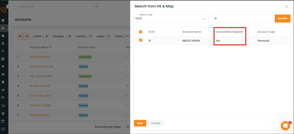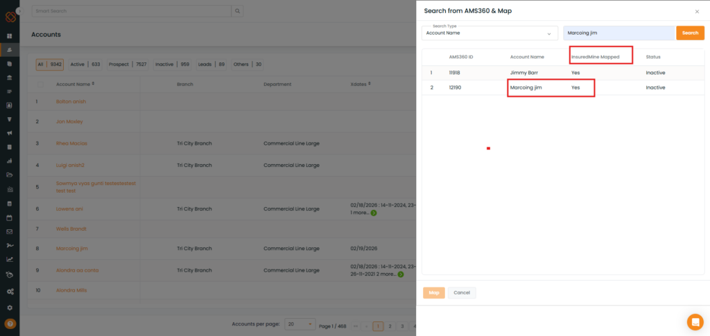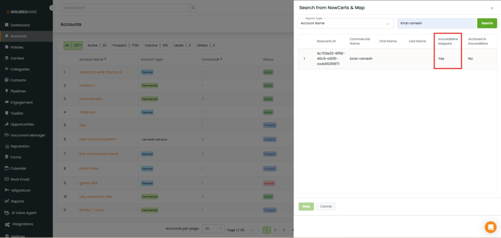 Once mapped, the account (e.g., Katrina ANDERSON) shows as InsuredMine Mapped.