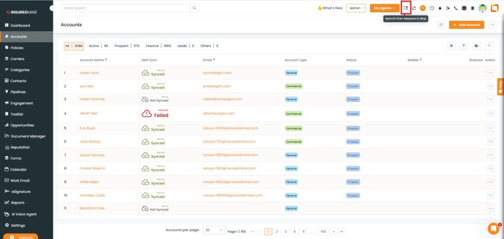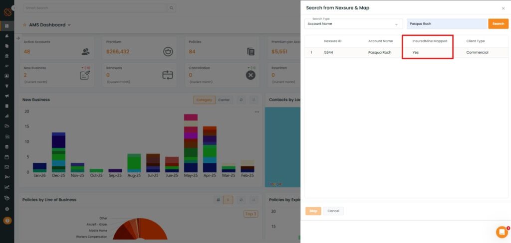 A new enhancement allows accounts created in AMS (Epic, Nexsure, and QQ) to be instantly imported into InsuredMine using the Search and Map options. This enhancement enables agents to sync and map accounts more easily and securely.