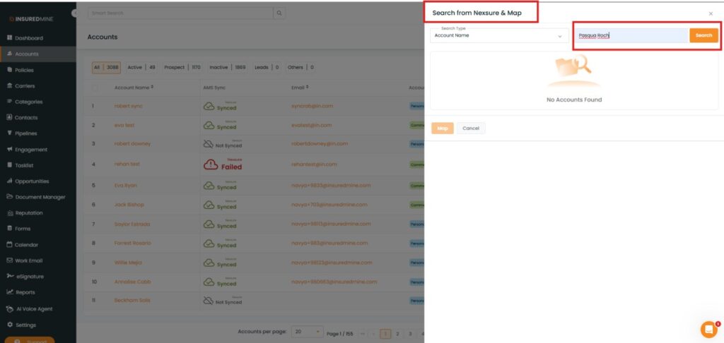 - Click the Map button at the bottom to map the selected account in InsuredMine.