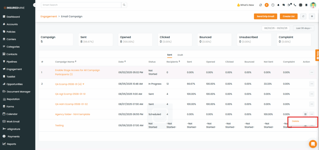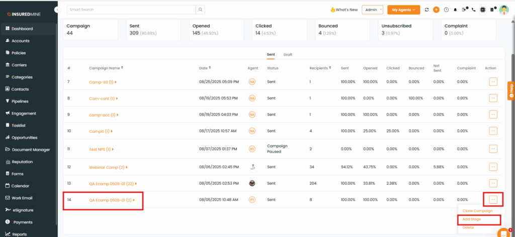 - Select the preferred agent email campaign in which you want to Add Stages.