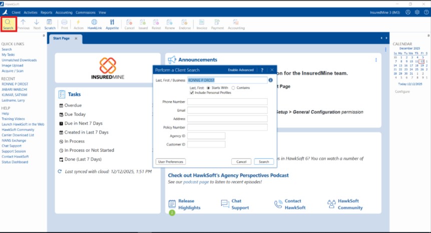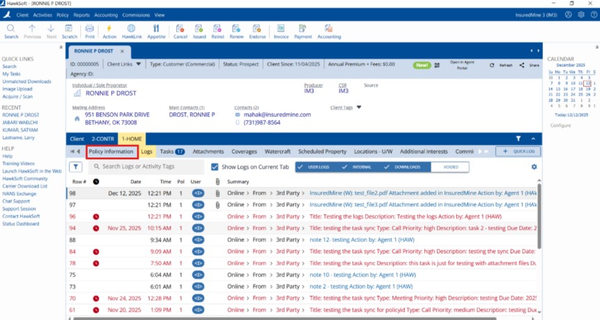 We have introduced a new enhancement for HawkSoft users. Now, all policy-related sync logs—including files, notes, and tasks—will sync and appear under the respective Policy section. Earlier, if a file, task, or note associated with a policy was synced from InsuredMine (IM), it was logged under Client/ account Logs instead of Policy.