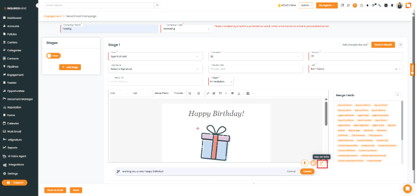 The Help Me Write feature has been introduced in Email Campaign, Automation, and Single Contact Drip within the Engagement module. This enhancement enables users to easily create, edit, and refine email or SMS content, ensuring more effective and personalized communication.