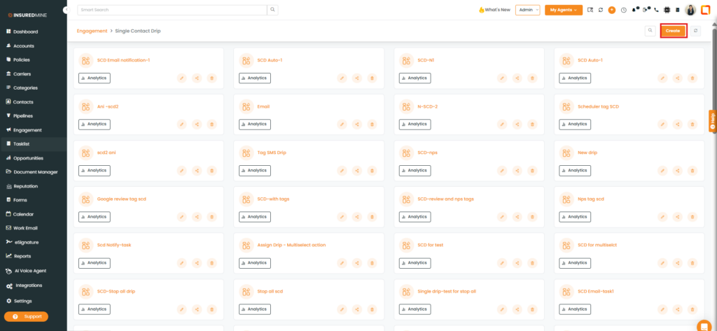 - Click Create for Email Campaign, Automation, or Single Contact Drip to view the enhancement.