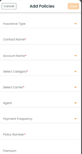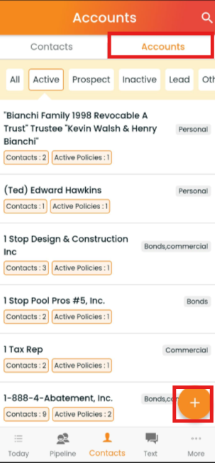 - A dropdown allows selection between Accounts, Contacts, and Policies.