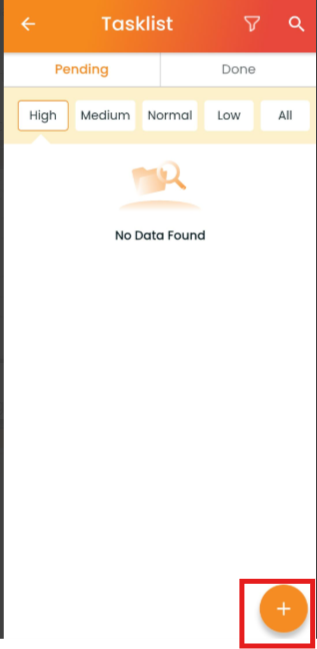Tasklist allows users to view and manage tasks under Pending and Done tabs, filter them by priority (High, Medium, Normal, Low, All), and create a new task using the + icon.