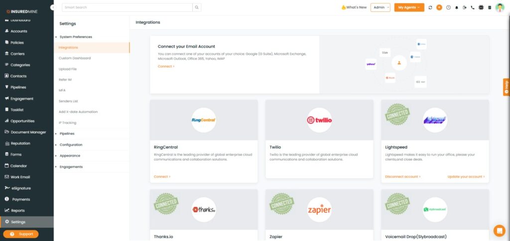 - Navigate to Settings in Insuredmine, make sure you have logged in as Admin.