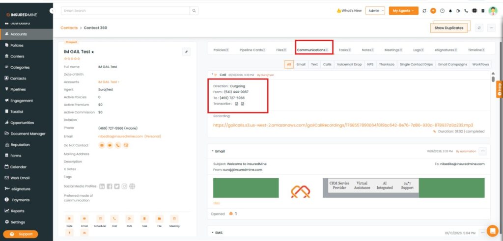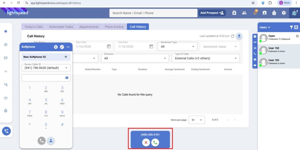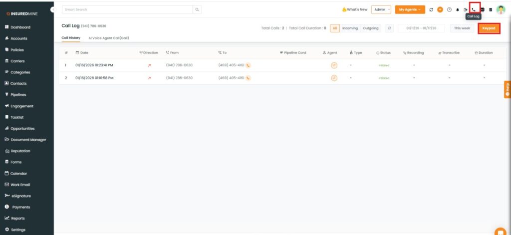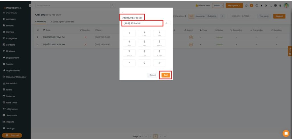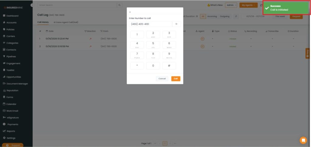 Lightspeed Voice, a voice calling application, facilitates making calls from the Agent portal. The InsuredMine and Lightspeed integration enables quick access to the client information while on call. It is possible to call clients directly from anywhere in the portal where the Call Log is available, if the number is mapped in InsuredMine.