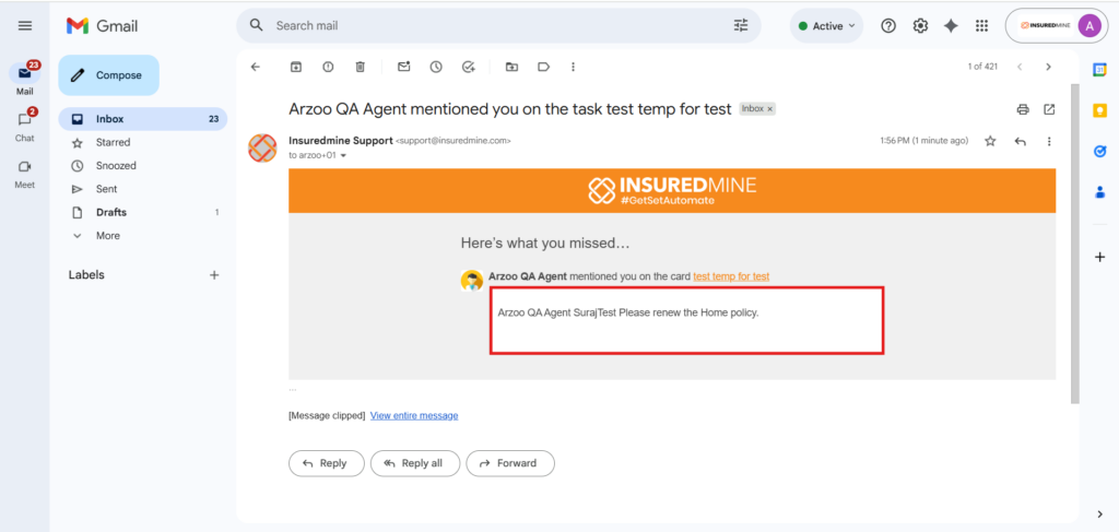 - The agent for whom the comment (task) is added receives the email in their Email Inbox.