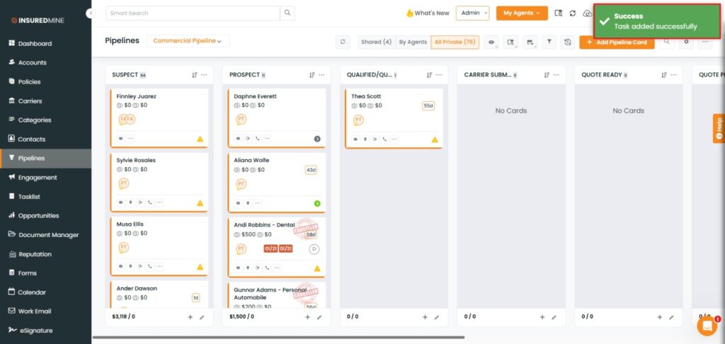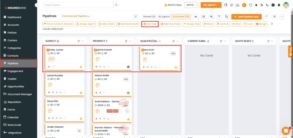 We have introduced a new enhancement in the Pipeline module that allows users to add tasks to multiple pipeline cards at once using the Add Task option.