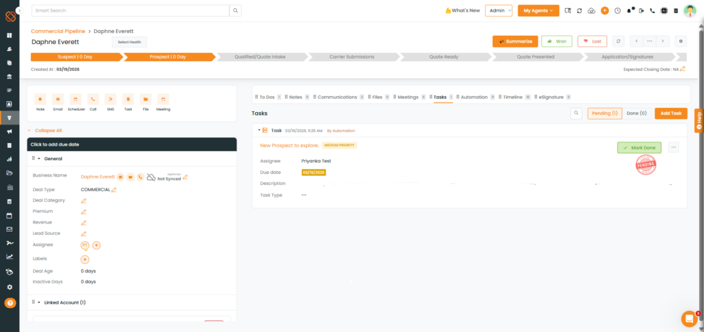 - Note: The added task will appear as pending in the Task section of the deal card.