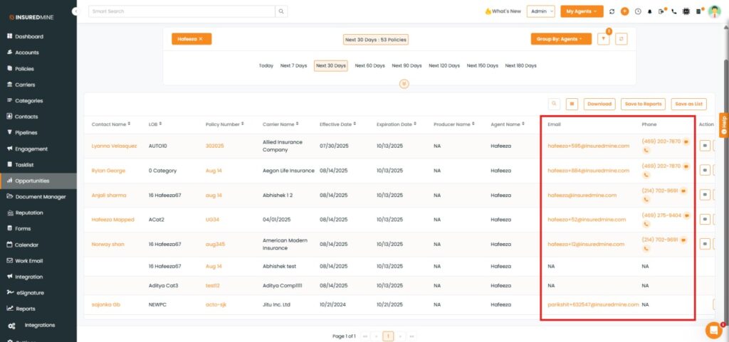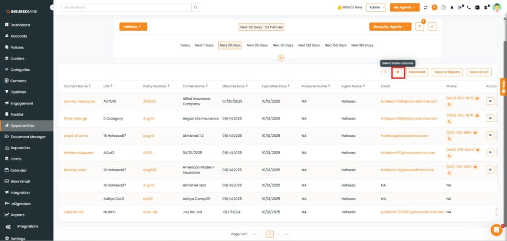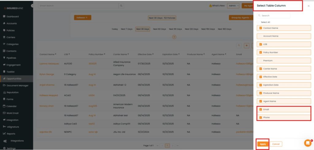 We have introduced a new enhancement under the Opportunities Module. A new column for Email and Phone has been added on the policies details page, and these columns can also be viewed in the Select Table Column.