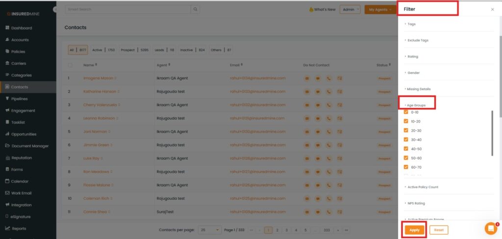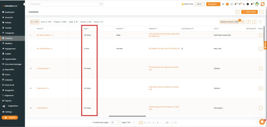 Use Case: Agents can quickly filter and view contact details belonging to specific or multiple age groups, helping them target communications, campaigns, or offers more effectively.