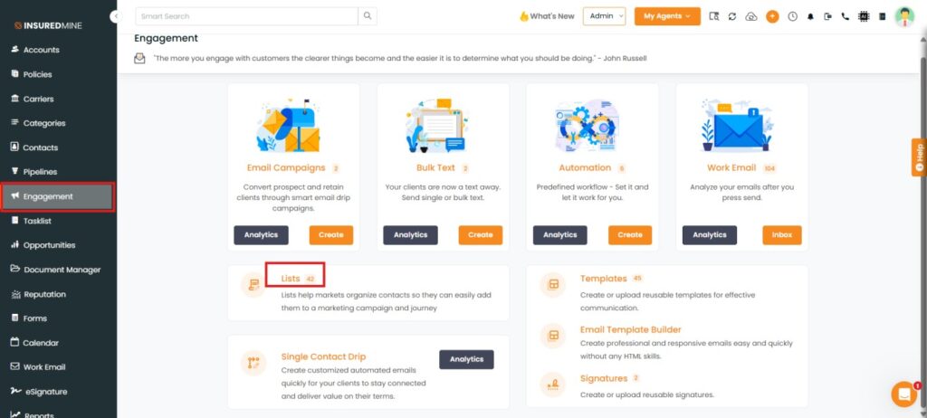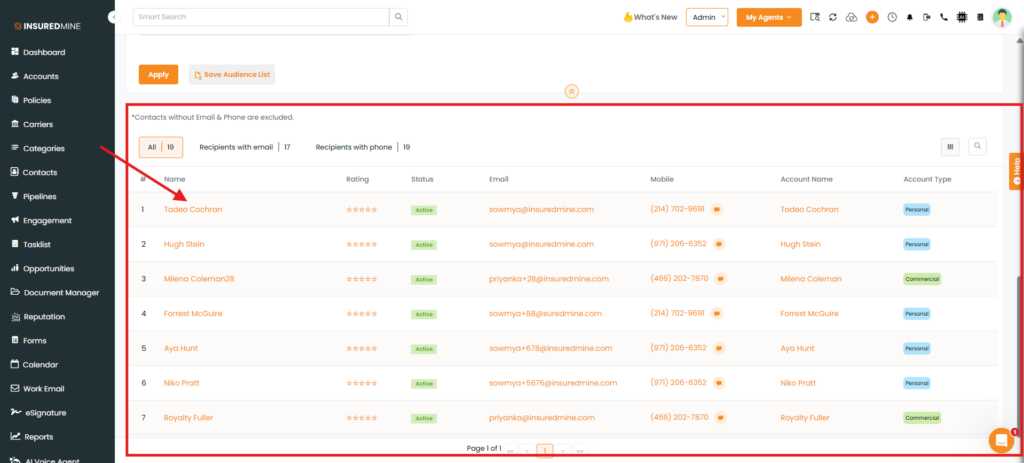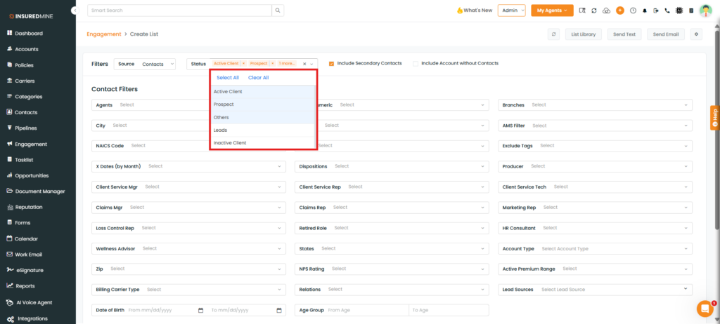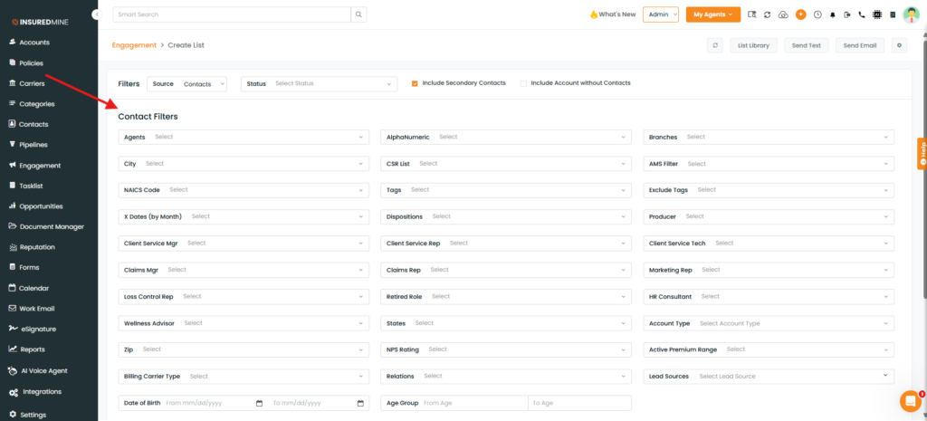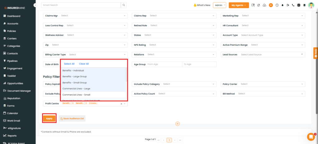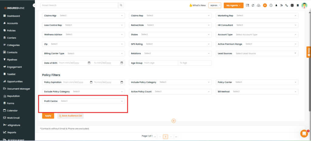 We have introduced a new enhancement in the Engagement module that allows users to filter contacts and accounts using the Profit Centre filter while creating a list. This helps refine contact and account selection based on specific business units in the Contacts and Accounts Policies section.