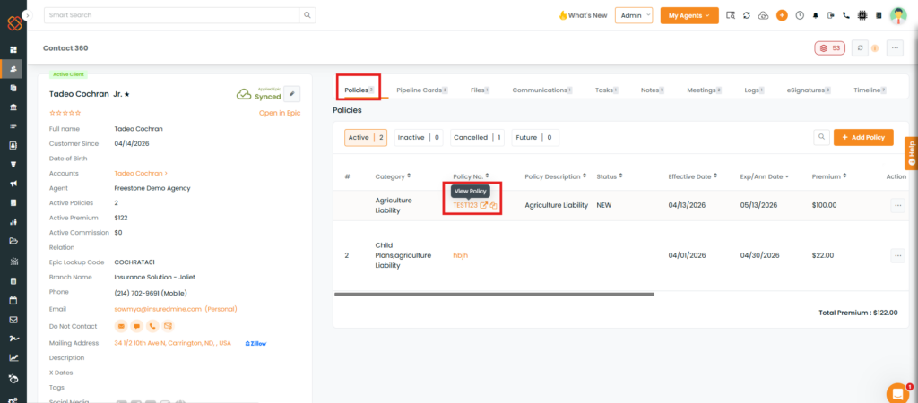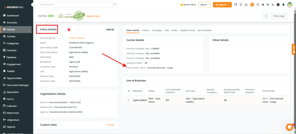 - Click on the Preferred contact name to view the Profit Centre in policy.