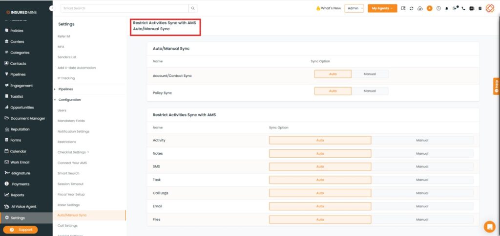 - You are redirected to the Restricted Activities Sync with AMS – Auto/Manual Sync page.