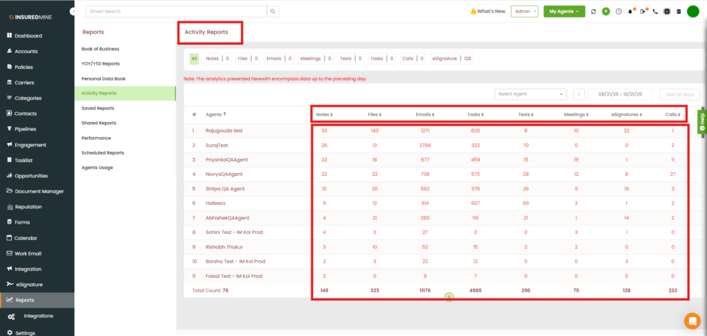 - As shown below, from the All to Calls view, you can see the data within your preferred date range and the individual Activity reports.