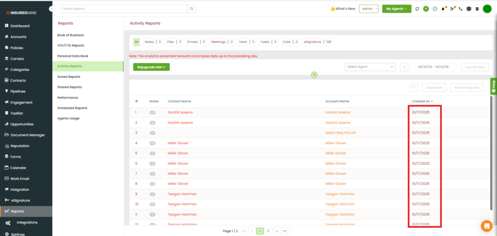 Use Case: This enhancement allows users to easily track and analyze when contacts were created, along with other activities within a specific date range. By default, it displays the latest created activity at the top. This helps in monitoring and verifying activity trends during the selected period.