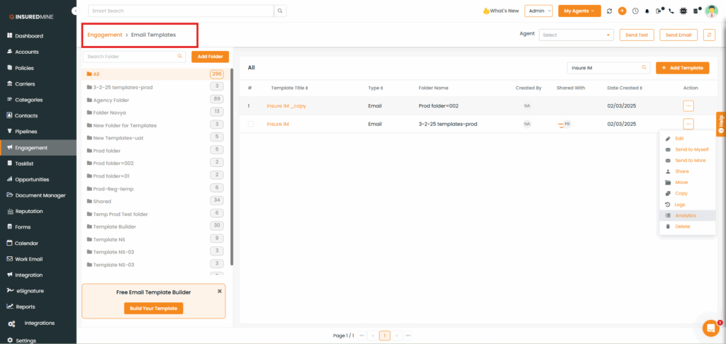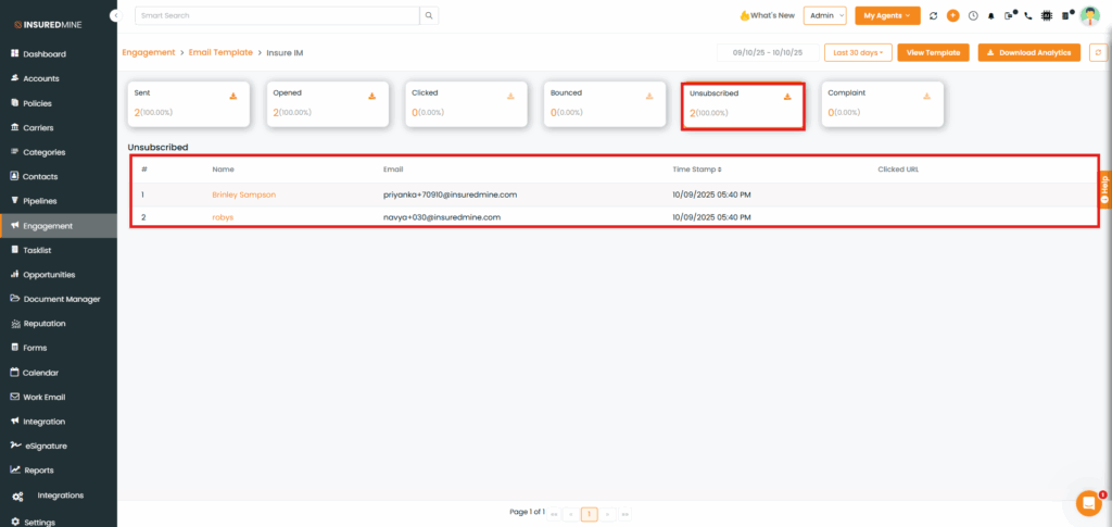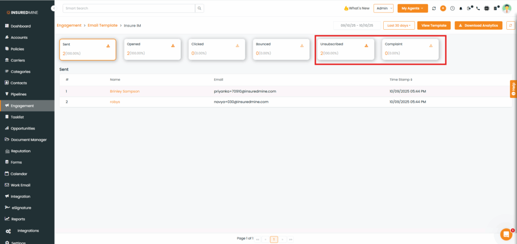 We have introduced a new enhancement under the Engagement module → Templates section. A new Unsubscribe and Complaint section has been added in Template Analytics. You can now view your email template data based on Unsubscribe and Complaint metrics.